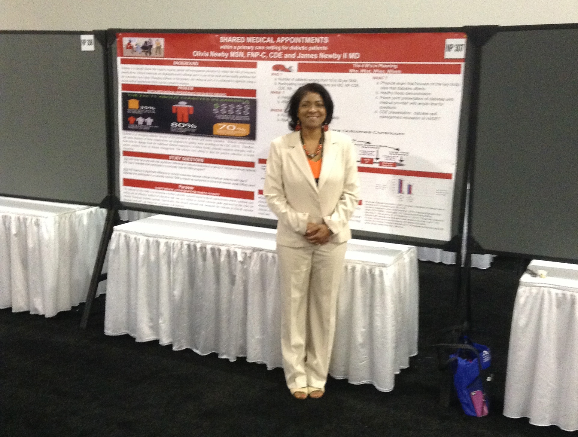 Olivia Newby, FNP standing in front of her Diabetes Shared Office Visit and Study Data poster presentation at the June 2013 American Association of Nurse Practitioners National Convention in Las Vegas, Nevada. She was invited to share this trendy way of educating people with diabetes. She and Dr. James Newby discussed with the conventioneers the impressive improvements that were obtained by the patients who participated in these shared visits.